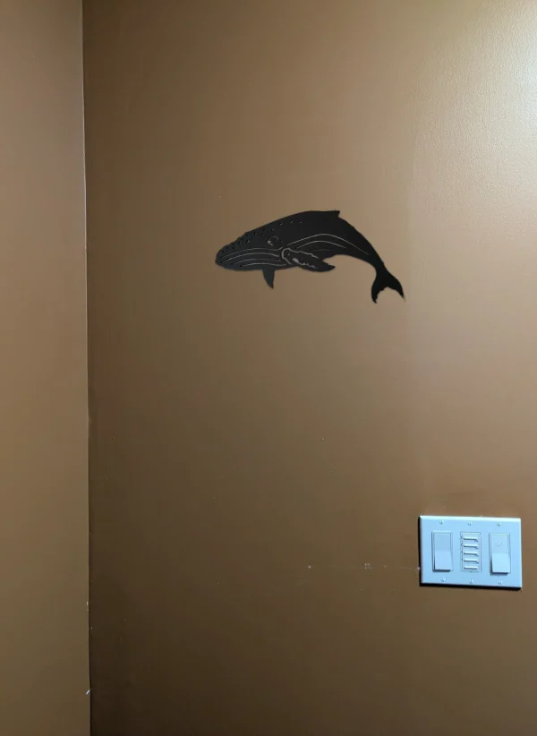 “Diving Humpback Whale Wall Art” (14.5×8″). 16-gauge steel, black-painted diving whale design with intricate cut-out details. A stunning nautical décor piece. Perfect for ocean lovers, home, or gifting. Rustic Soul NL.