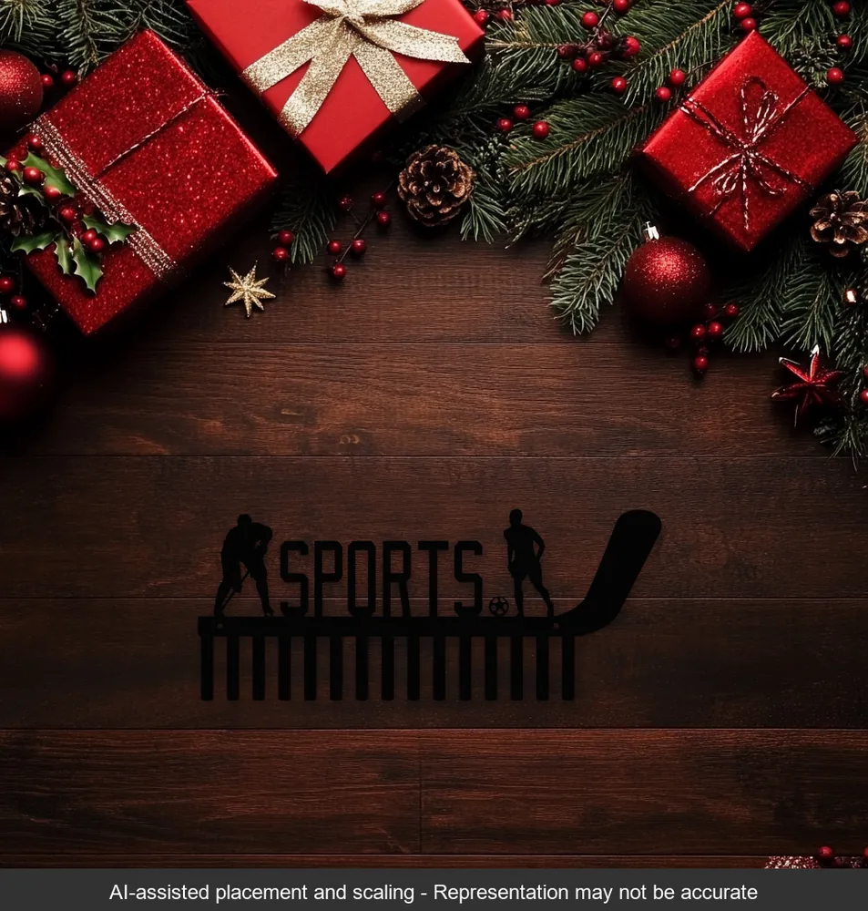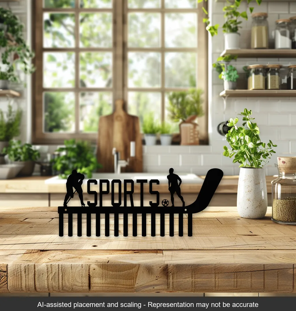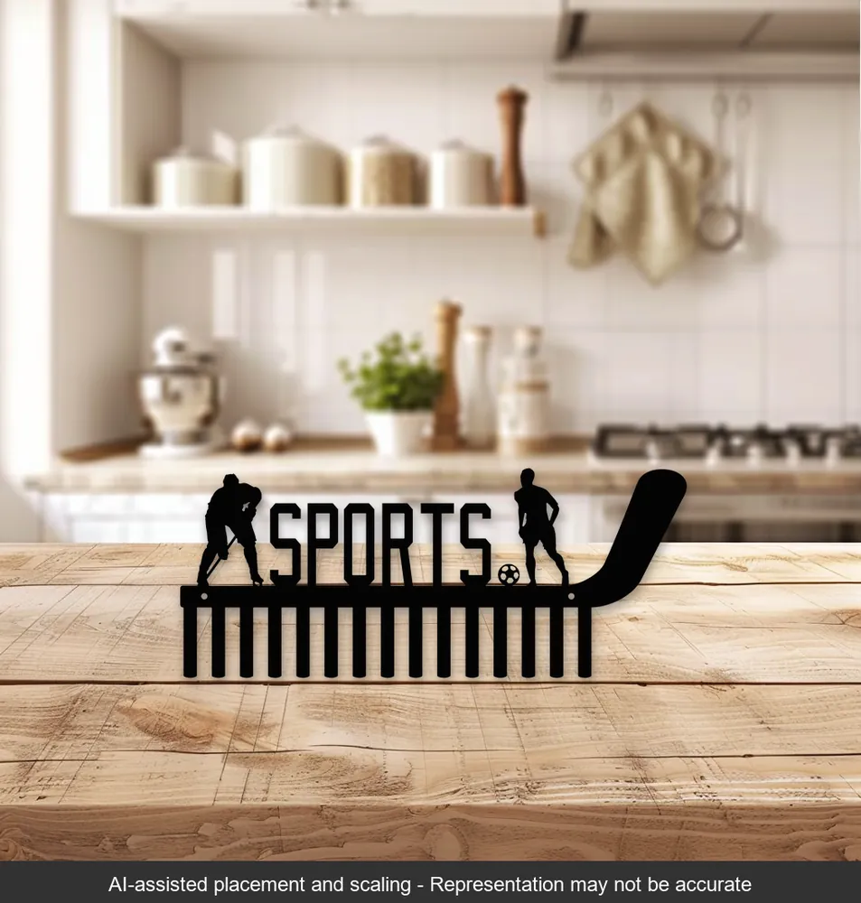 This 18×7.5in Sports Steel Medal Holder is a stunning piece of craftsmanship, designed for the dedicated athlete. Featuring high-quality laser-cut designs of a hockey player and a soccer player on either side, this sleek black-painted holder exudes elegance and functionality. With its precise craftsmanship and durable steel construction, it offers a perfect blend of style and utility. Ideal for organizing medals, it complements any sports enthusiast’s decor with its modern aesthetic and practical design.