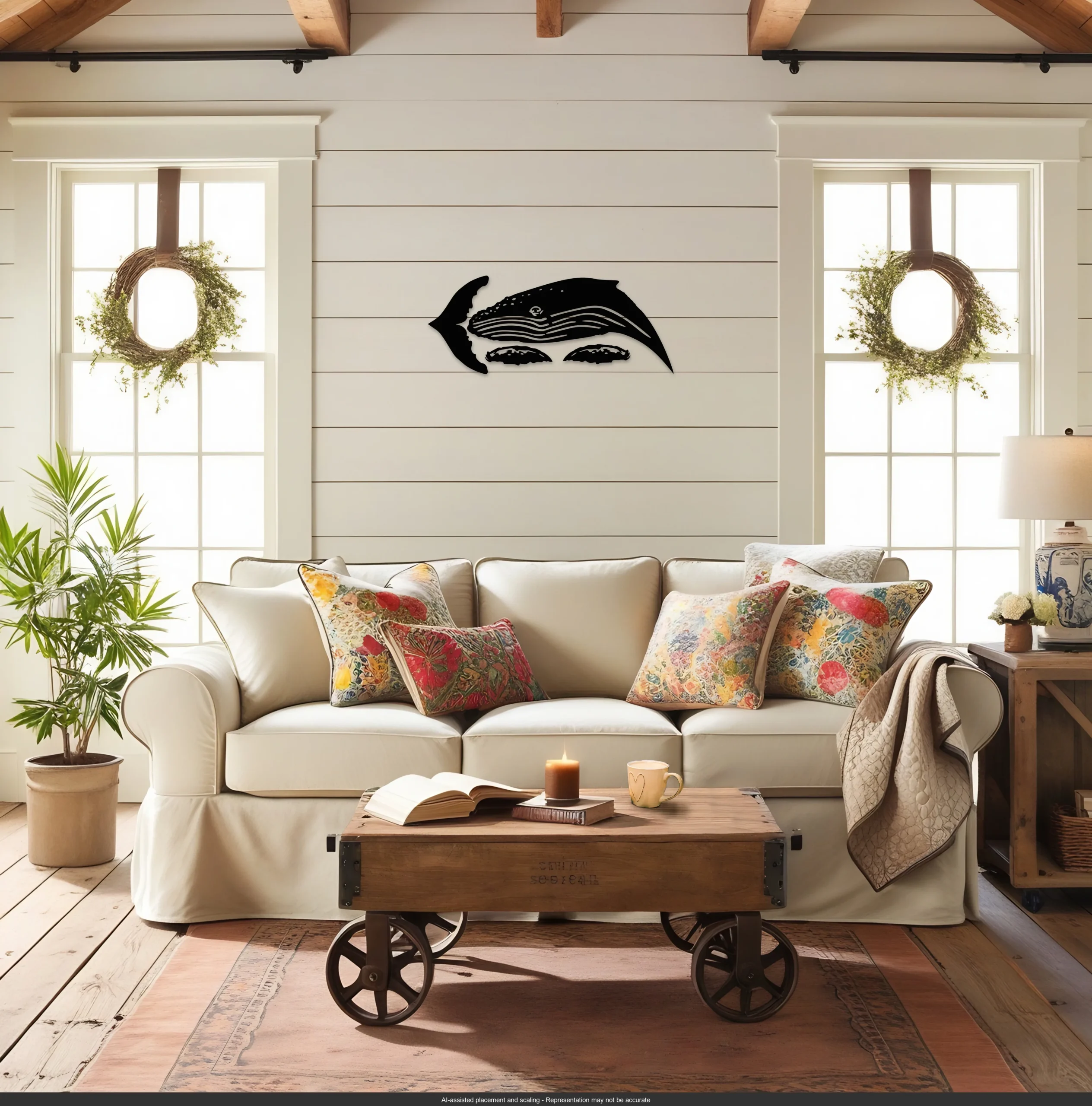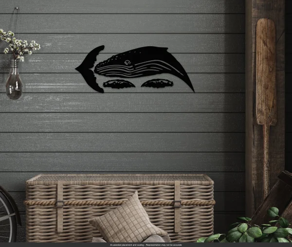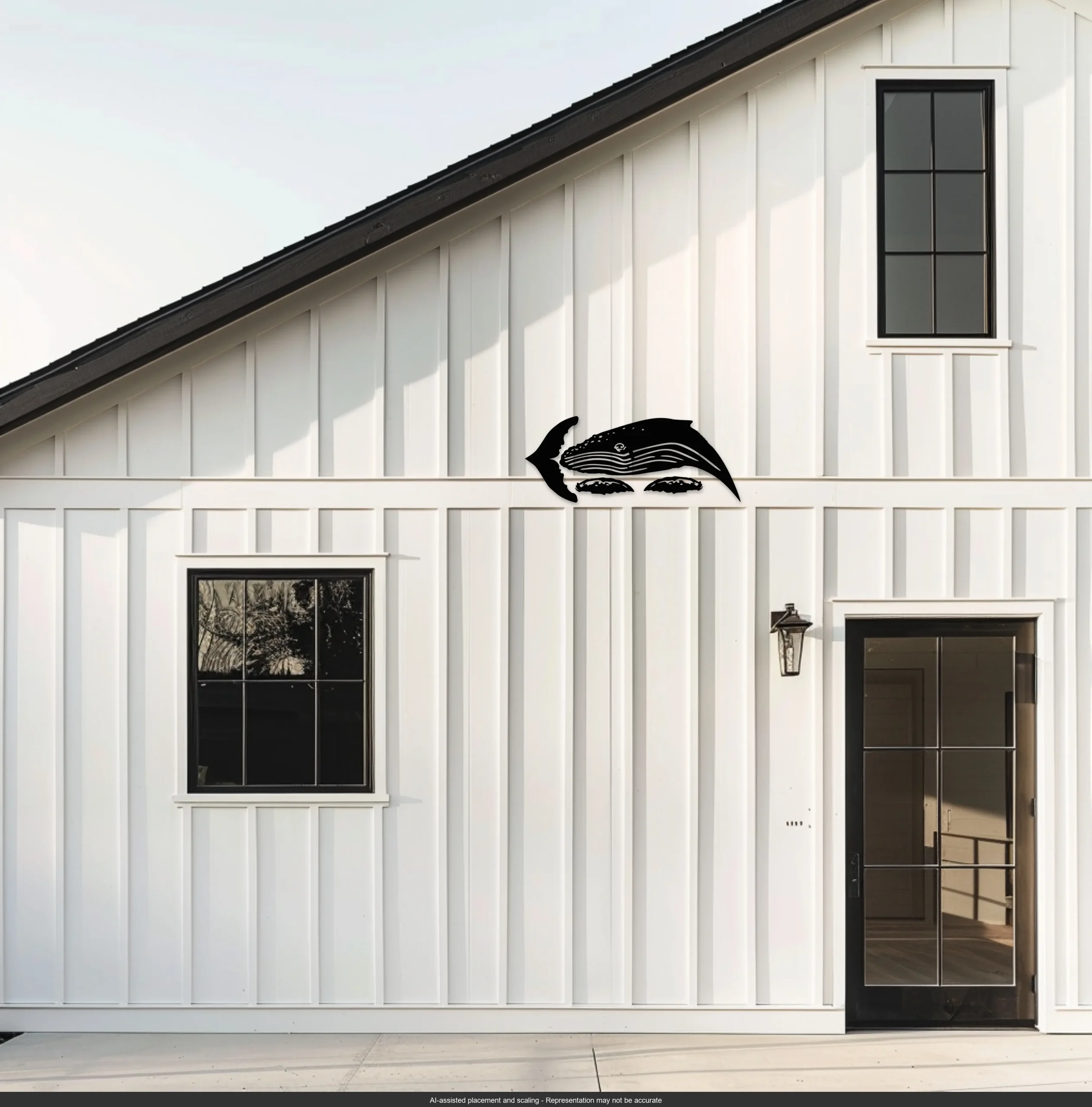 “Diving Humpback Whale Wall Art” (36×16.5″). 16-gauge steel, black-painted diving whale design with intricate cut-out details. A stunning nautical décor piece. Perfect for ocean lovers, home, or gifting. Rustic Soul NL.
