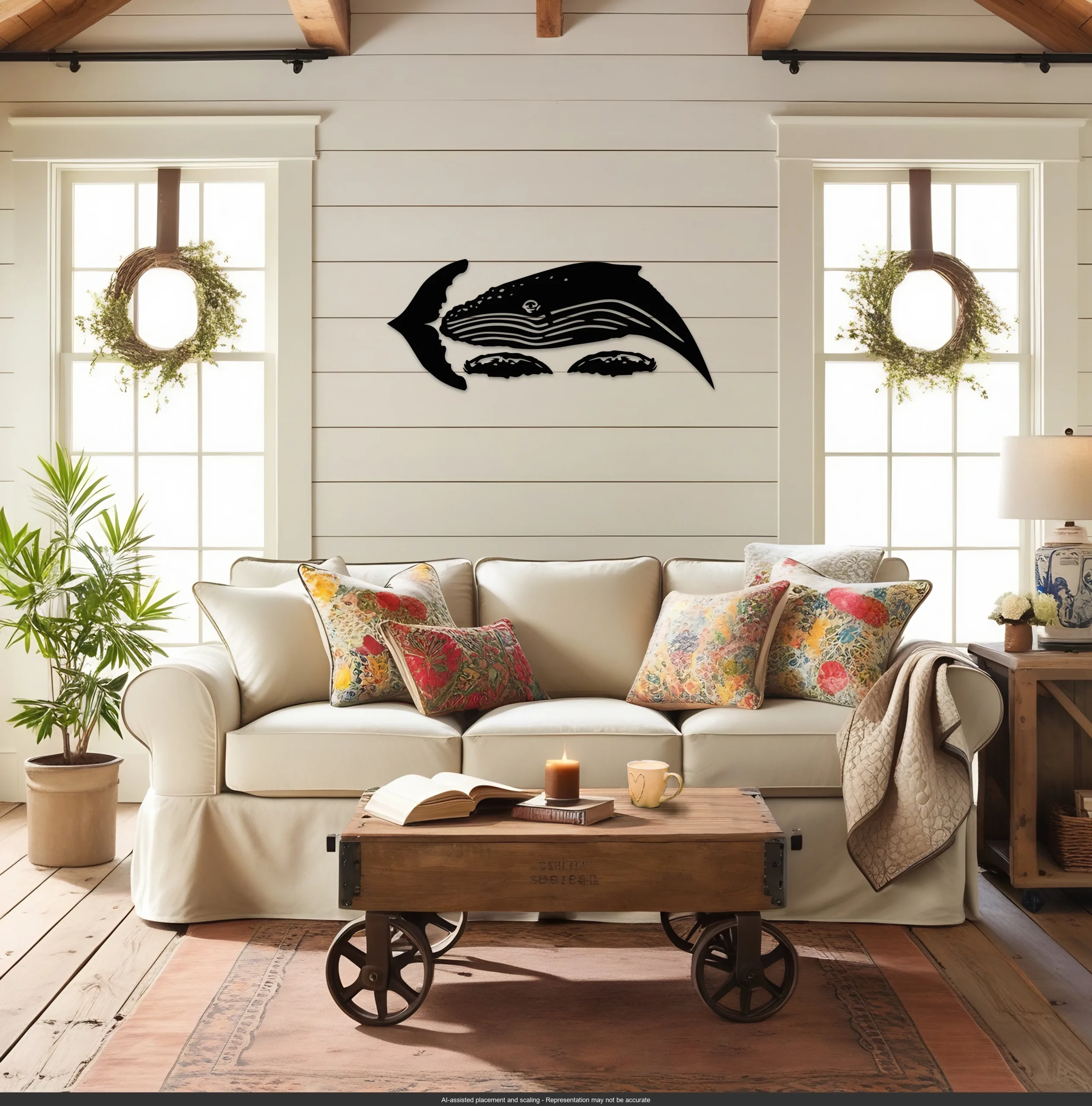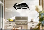 “Diving Humpback Whale Wall Art” (48×22″). 16-gauge steel, black-painted diving whale design with intricate cut-out details. A stunning nautical décor piece. Perfect for ocean lovers, home, or gifting. Rustic Soul NL.