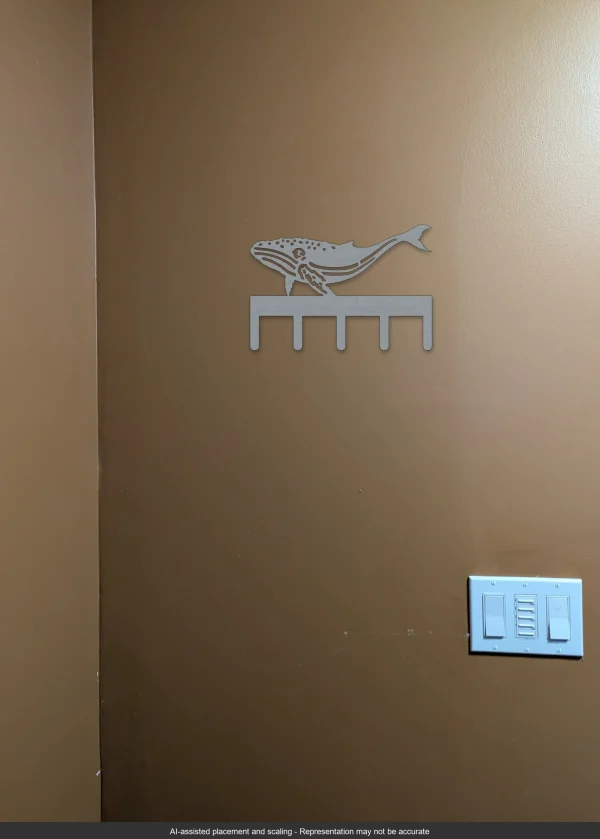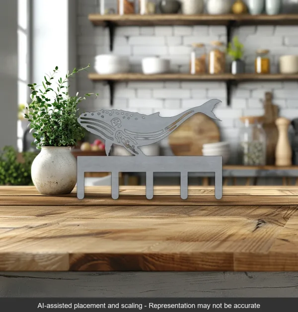 This high-quality laser-cut steel key rack features a stunning humpback whale design, bringing a touch of the ocean into your home. Crafted with precision, the raw steel finish highlights the intricate details of the whale, making it a perfect blend of art and functionality. Measuring 10.0″ W x 7.0″ H, this key rack offers five hooks, providing ample space to organize your keys or other small items while adding a nautical theme to your decor.