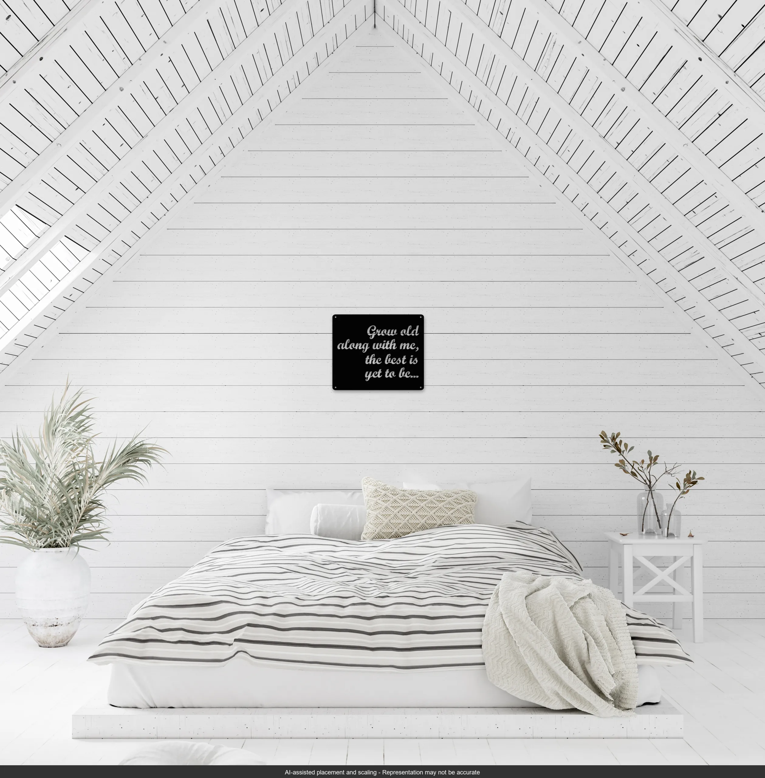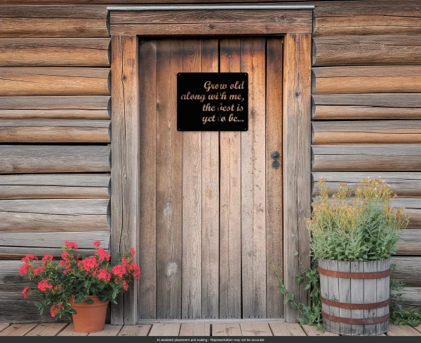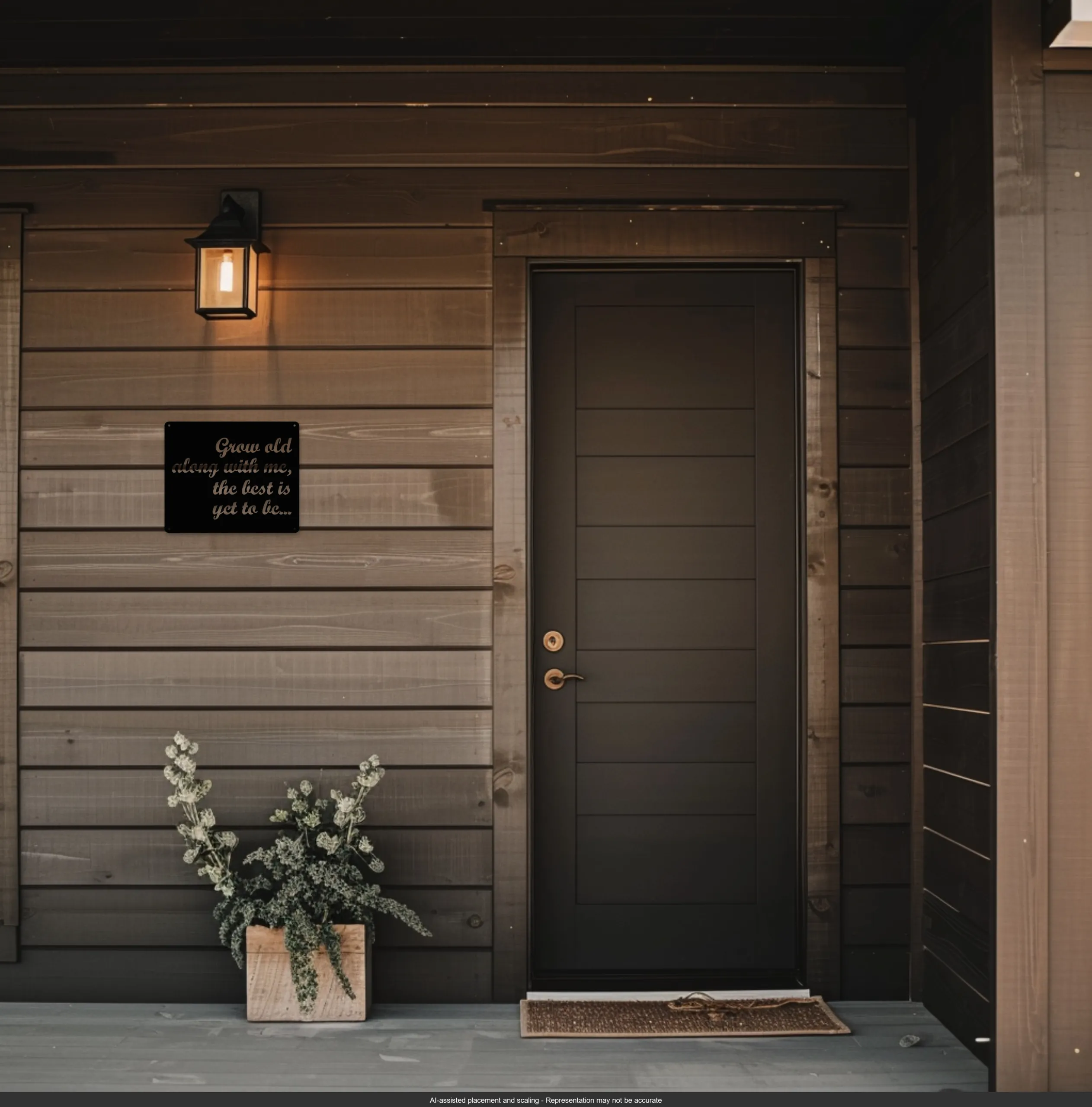 Celebrate enduring love and shared adventures with our Timeless Journey: Grow Old Along with Me wall sign. Crafted from sturdy 16-gauge steel and finished in a sleek matte black, this 14-inch by 14-inch rectangular piece features the heartfelt phrase, “Grow Old Along with Me, the Best is Yet to Come,” elegantly cut into the metal. The bold yet graceful lettering serves as a daily reminder that life’s greatest moments are still ahead, making it a perfect addition to a cozy home, a thoughtful anniversary gift, or a meaningful statement in any space. Whether displayed in a bedroom, entryway, or living area, this Rustic Soul NL creation blends timeless sentiment with modern craftsmanship.