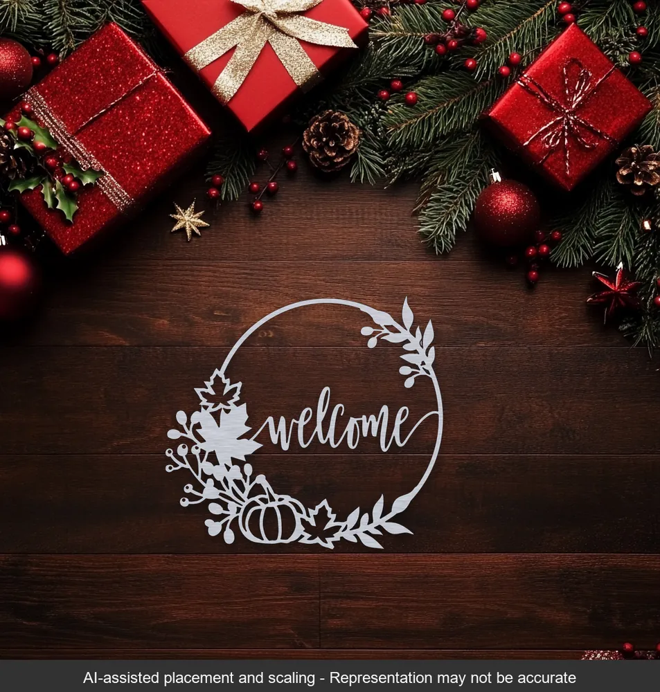 Celebrate the cozy charm of autumn with our Welcome Pumpkin Wreath wall sign. Expertly crafted from 1/8-inch aluminum, this 12-inch by 13-inch cut-out piece features the word “Welcome” elegantly integrated into a circular wreath design, complete with leaves, berries, and a pumpkin silhouette. The precision-cut details create a festive and inviting aesthetic, making it a perfect addition to seasonal décor, entryways, or as a thoughtful fall-inspired gift. Whether displayed indoors or outdoors, this Rustic Soul NL creation blends craftsmanship with timeless autumn warmth.