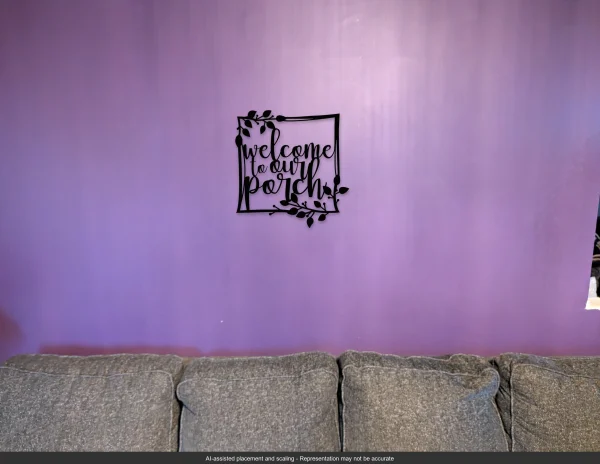 “Welcome to Our Porch Wall Sign” – 16″ x 17″, 16-gauge steel, painted black with vine accents. Ideal for porches and outdoor entryways. Rustic Soul NL.