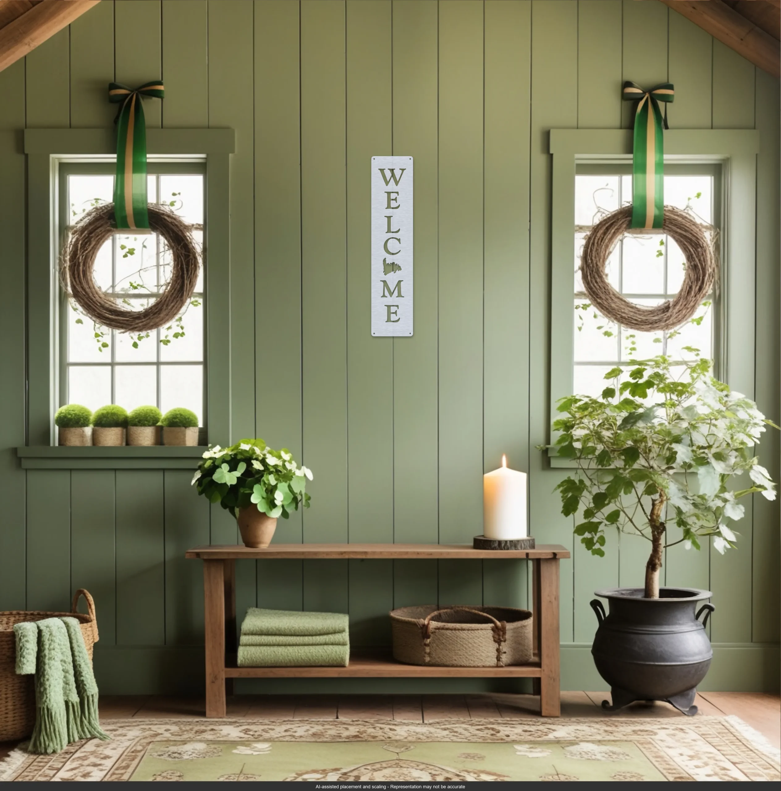 “Welcome with Newfoundland Map Wall Sign” (7.5×30″). 1/8-inch aluminum, precision-cut vertical lettering with map replacing the “O.” A bold décor piece. Perfect for entryways, cabins, or gifting. Rustic Soul NL.