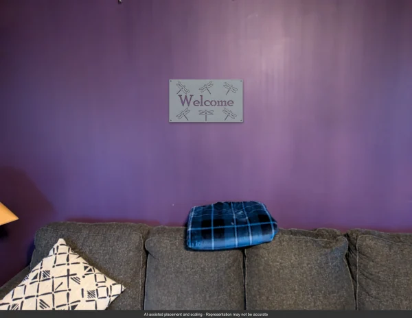 Welcome guests with a touch of nature’s elegance. Our Wings of Welcome: Dragonfly Harmony wall sign is expertly cut from 16 gauge steel, measuring 16 inches wide by 9.5 inches high. The design centers on the word “Welcome,” perfectly framed by six delicate dragonflies—three arranged above the text and three below—creating a balanced, eye-catching composition. The intricate cutouts capture the graceful contours of each dragonfly, evoking the light, fluttering essence of these enchanting creatures. Ideal for your entryway or any space in need of a warm greeting, this Rustic Soul NL creation blends modern craftsmanship with nature-inspired artistry to make every arrival feel truly special.
